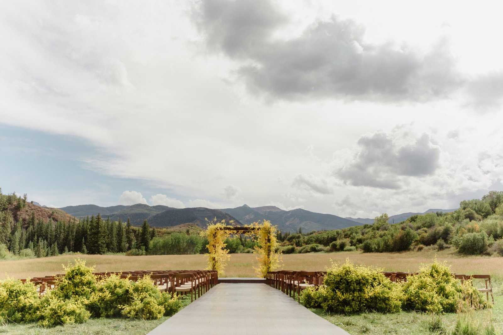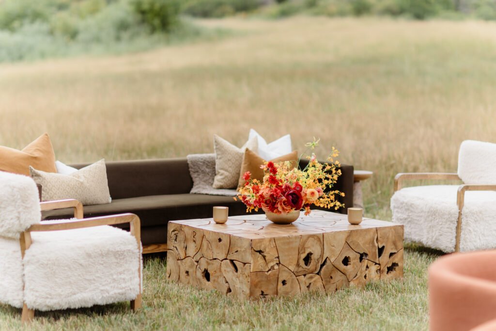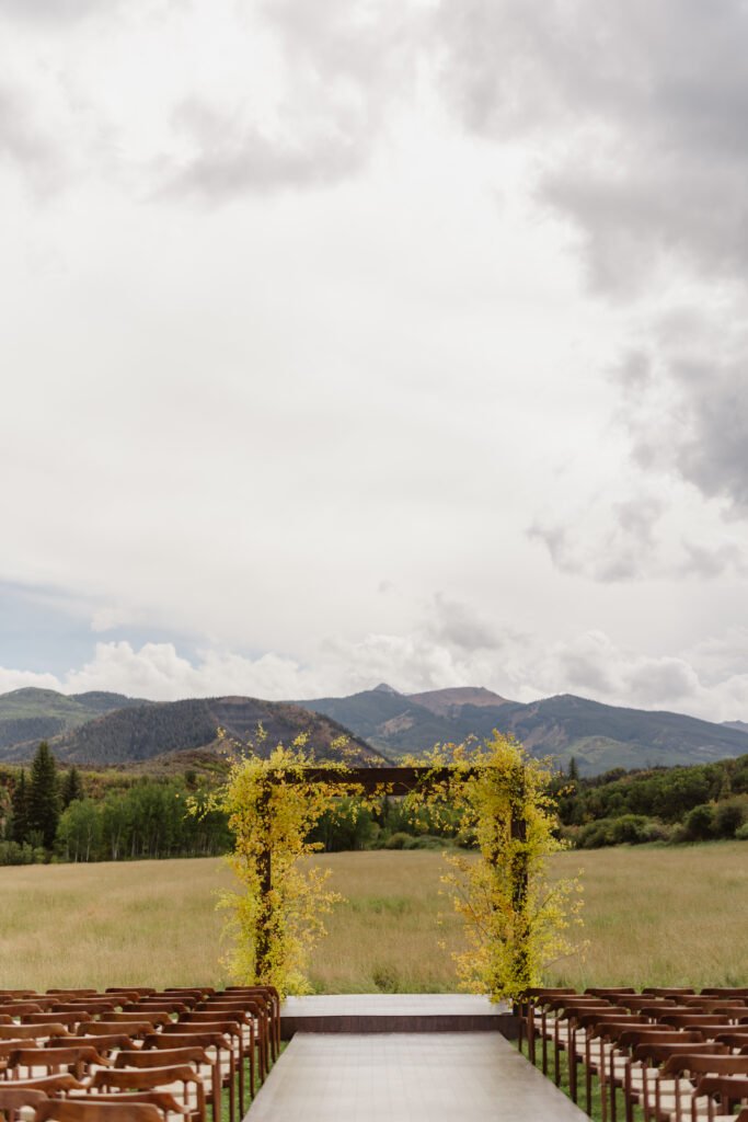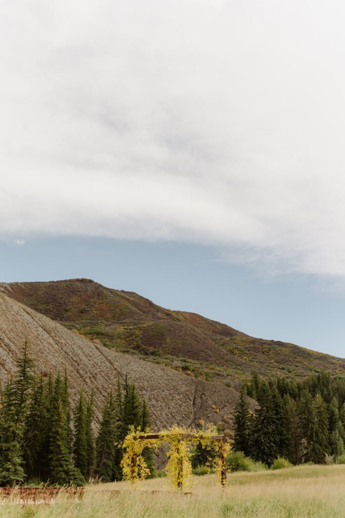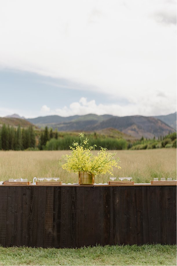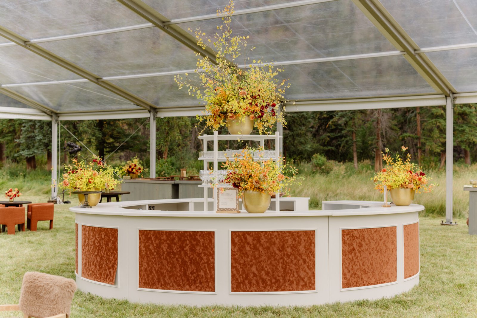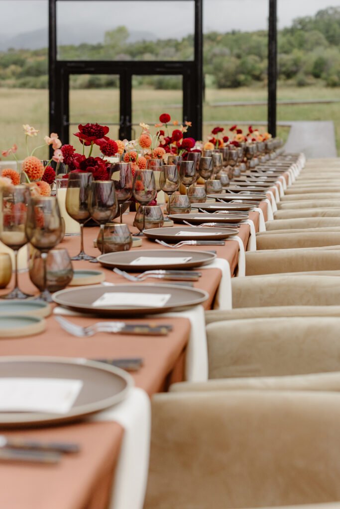 Although we built a tent for the reception, it was important that the whole day felt connected to the landscape around us. We were heavily inspired by the local foliage in Aspen during the fall and leant into textural bronze, yellow, and burgundy tones.