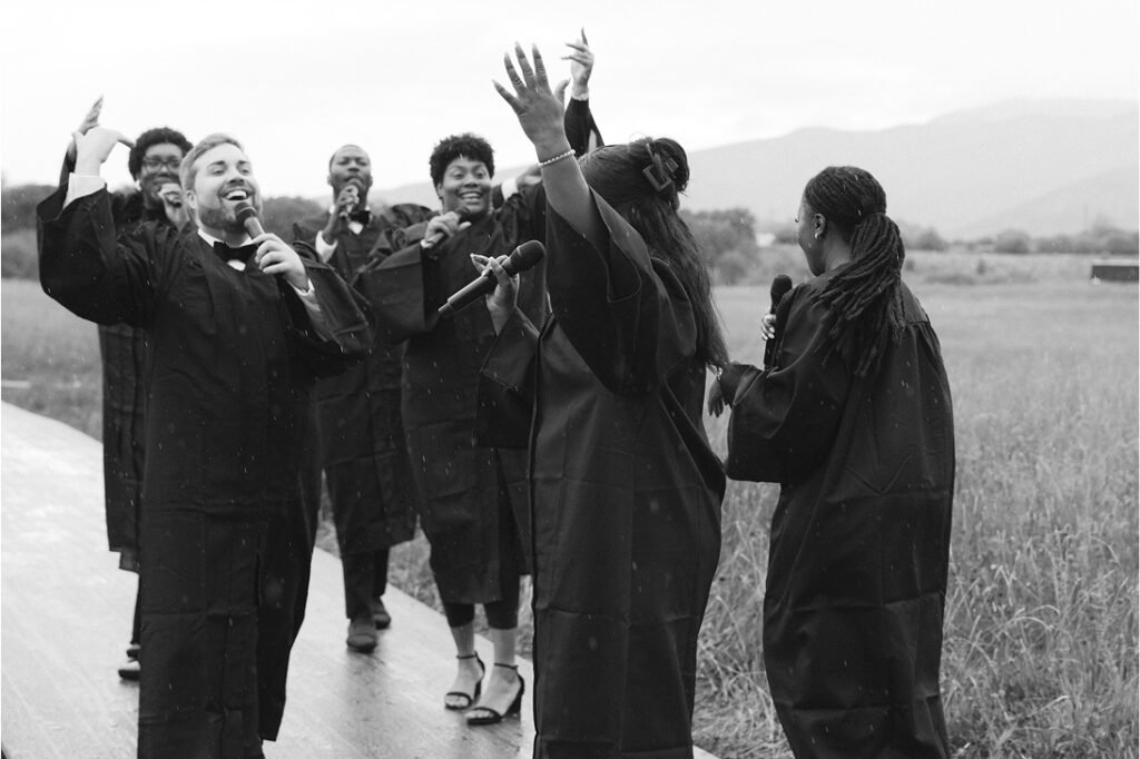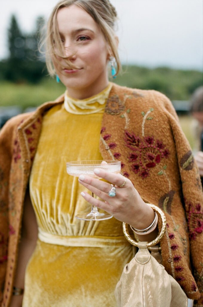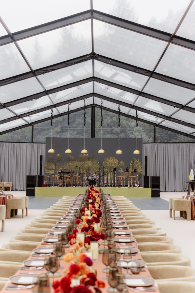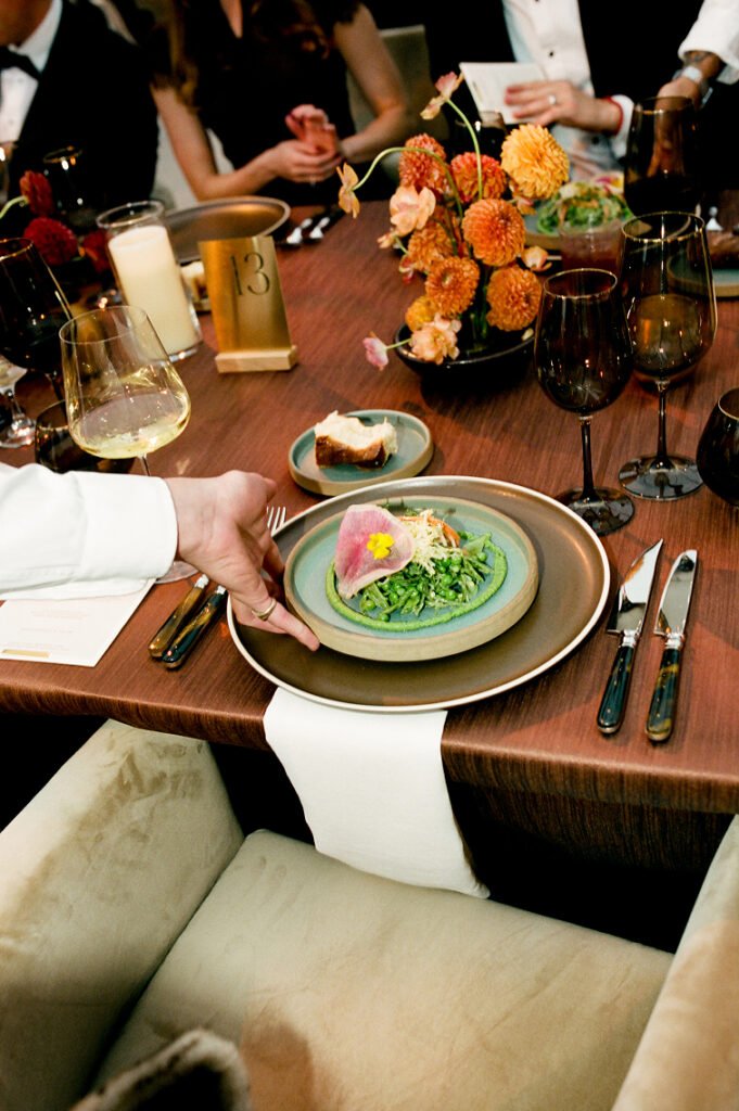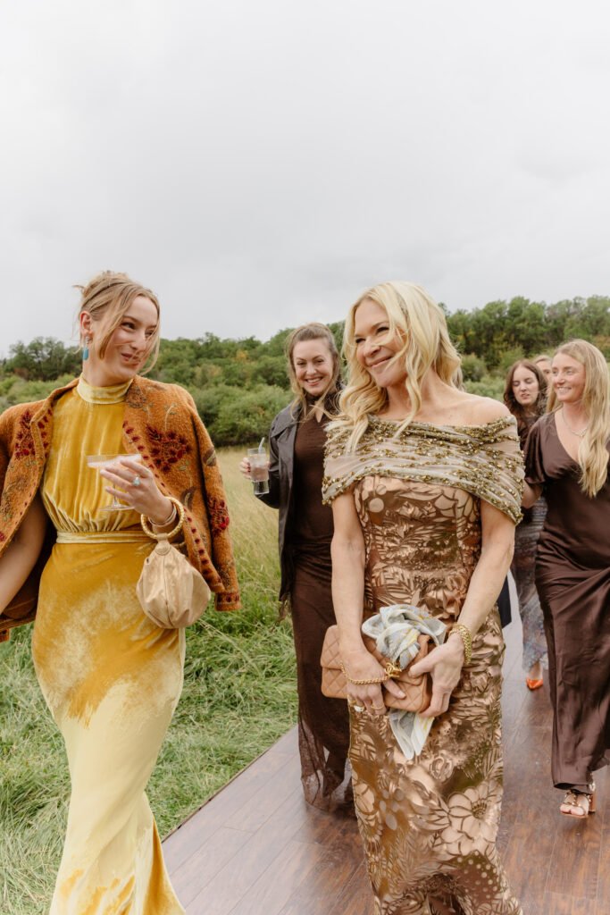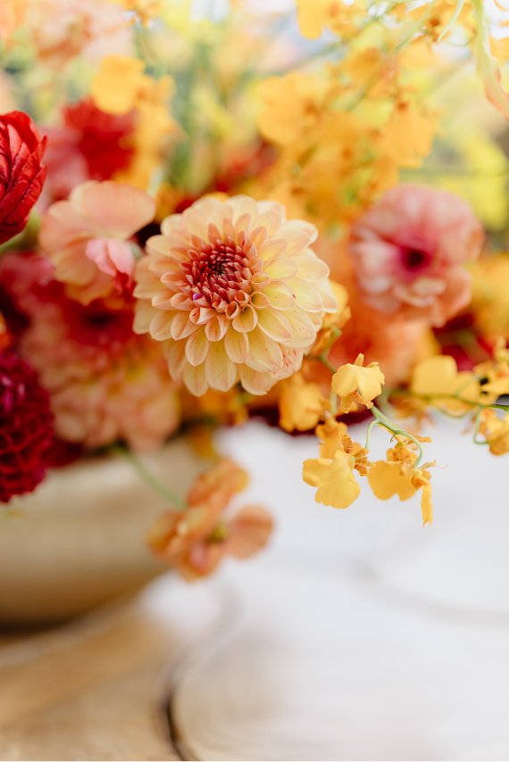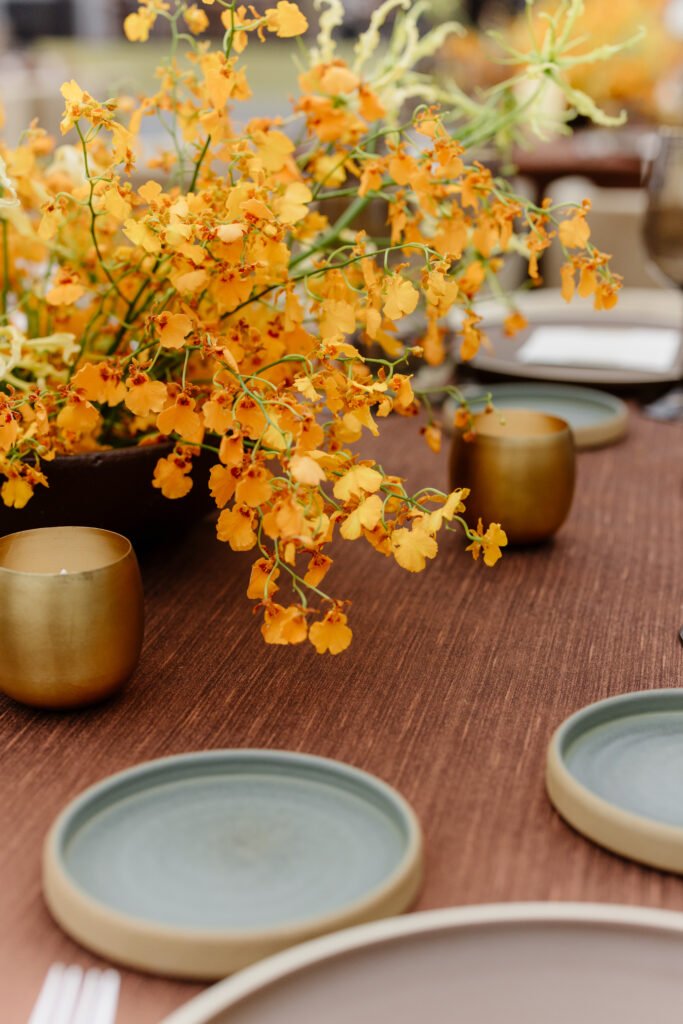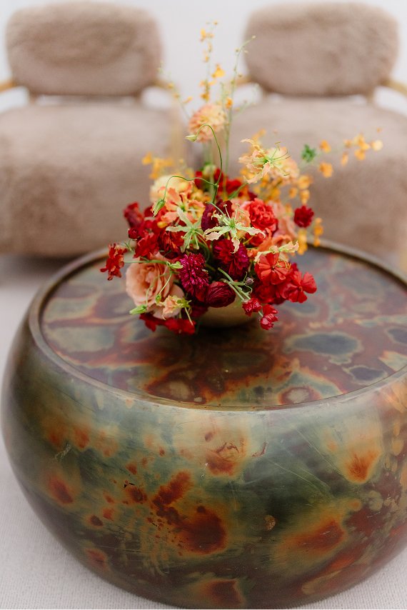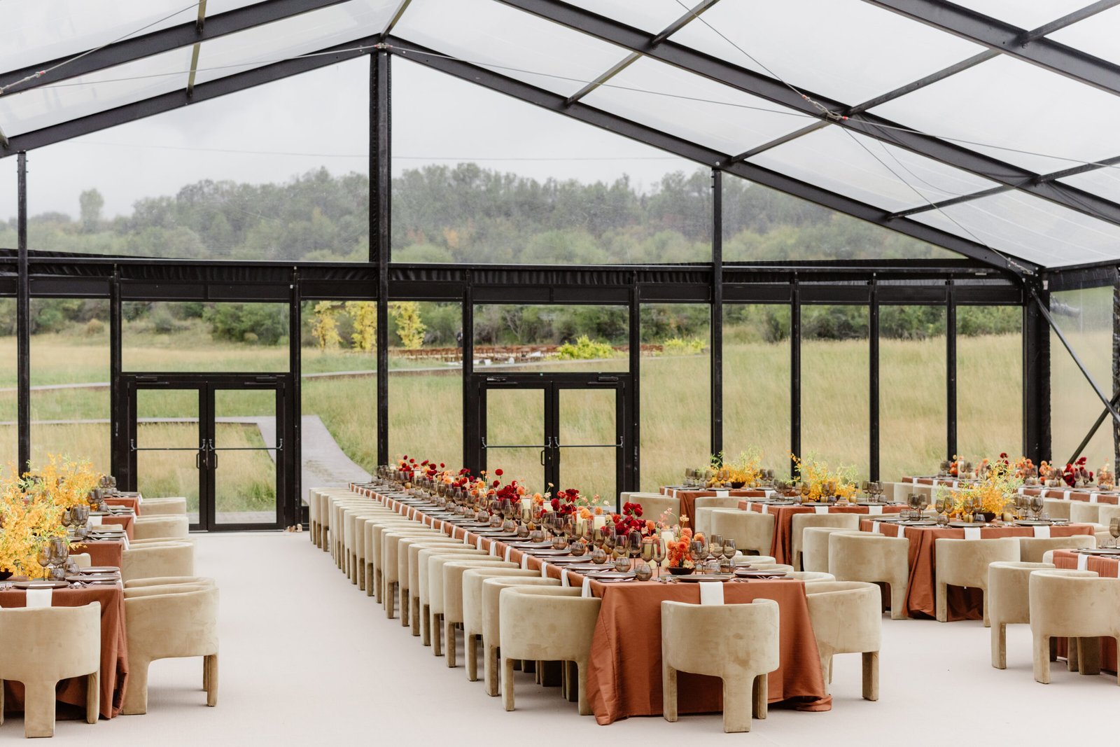 Although we built a tent for the reception, it was important that the whole day felt connected to the landscape around us. We were heavily inspired by the local foliage in Aspen during the fall and leant into textural bronze, yellow, and burgundy tones.