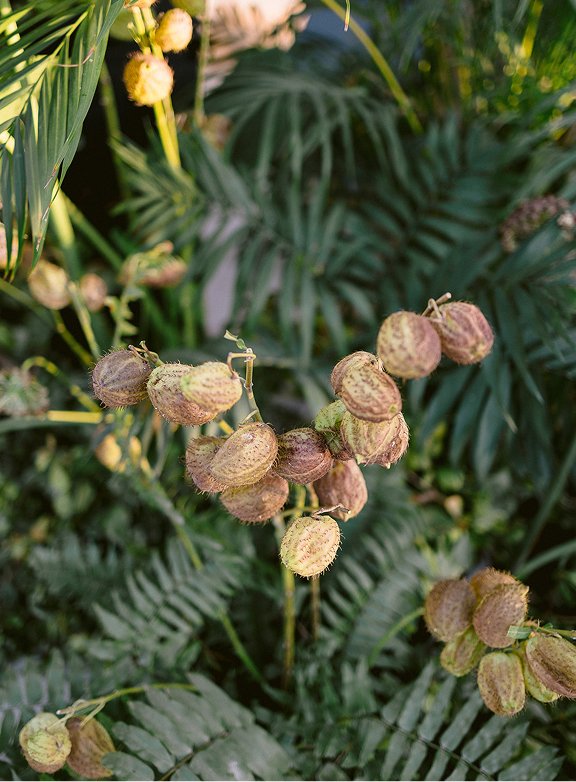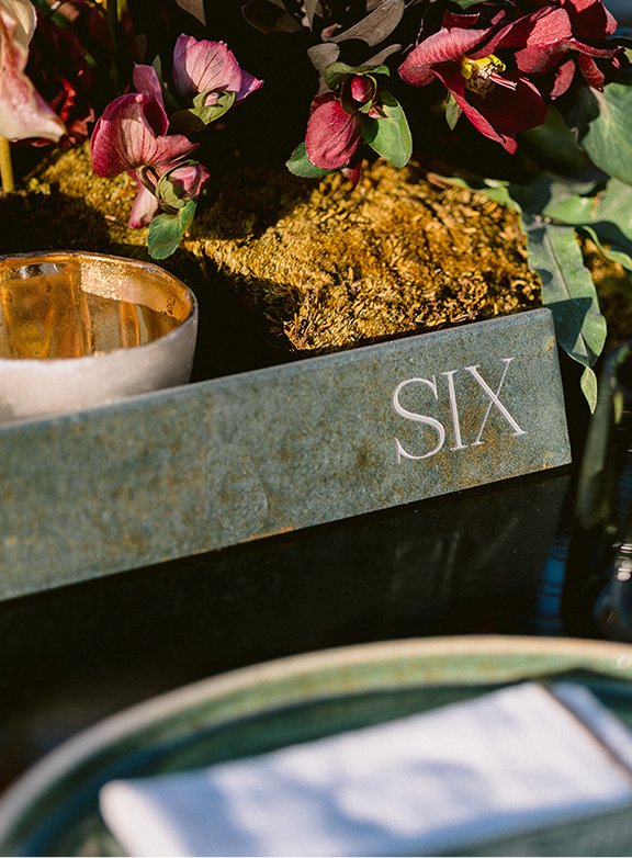 Green ceramic dinnerware, green linen dinner menus, etched green tile table numbers, and installed masses of foliage and floral growing from the tabletops transforming the space into a desert oasis.