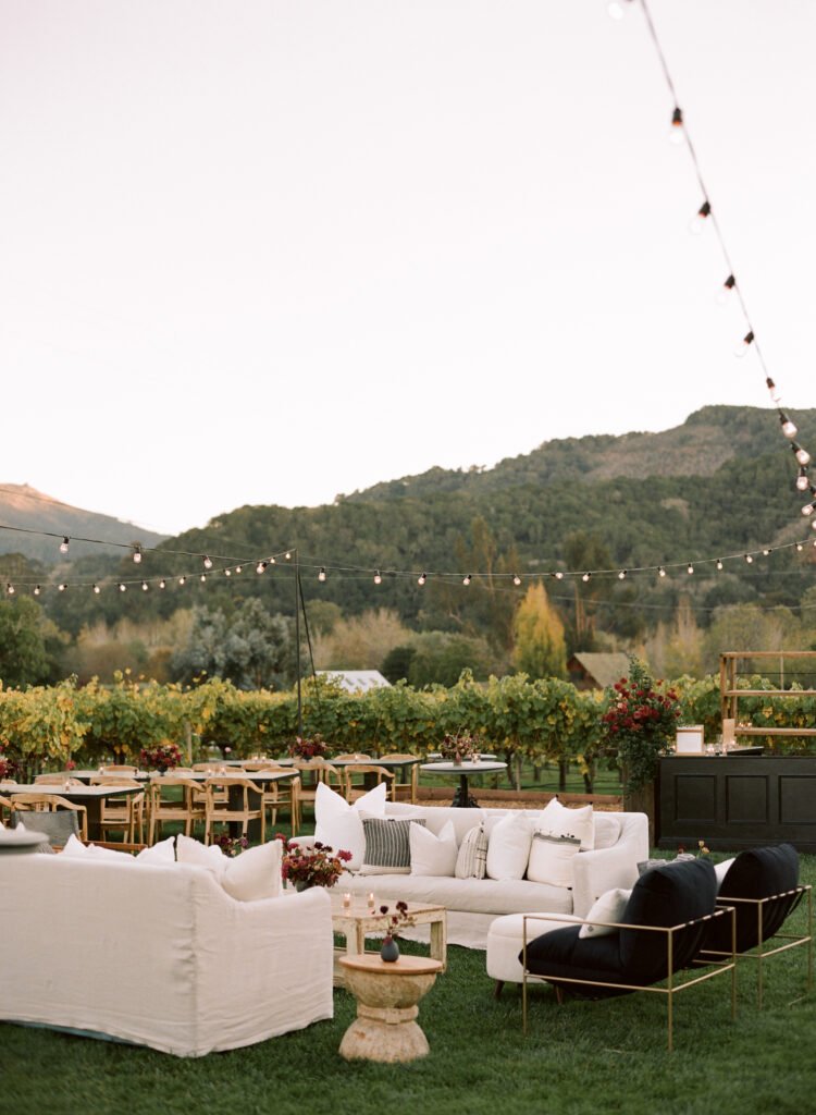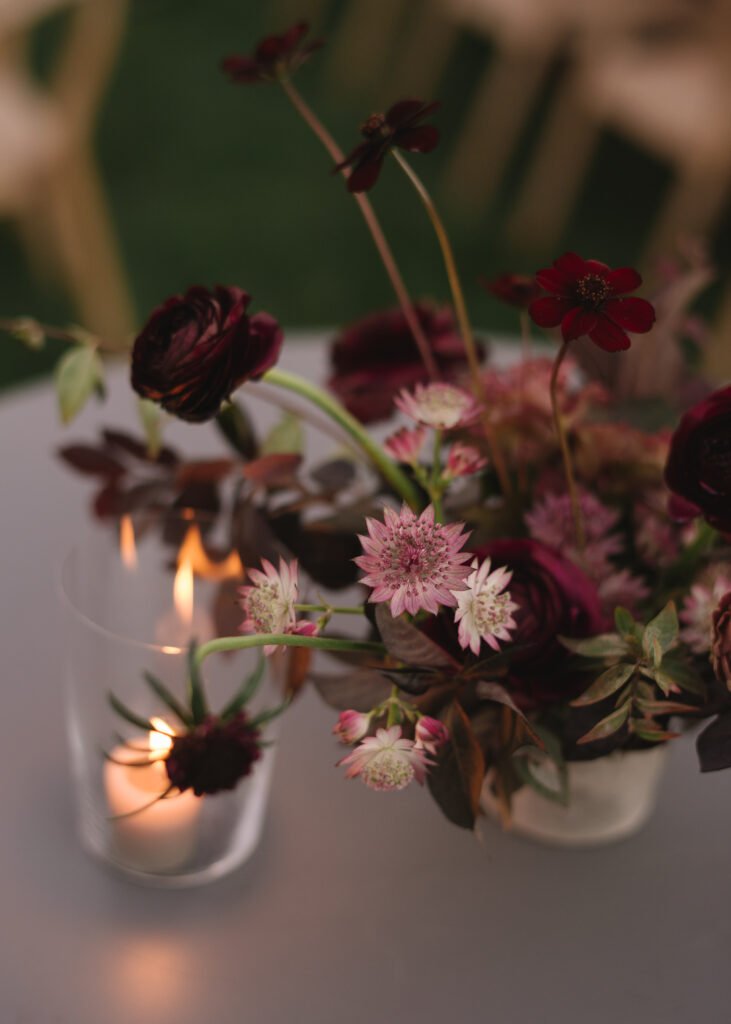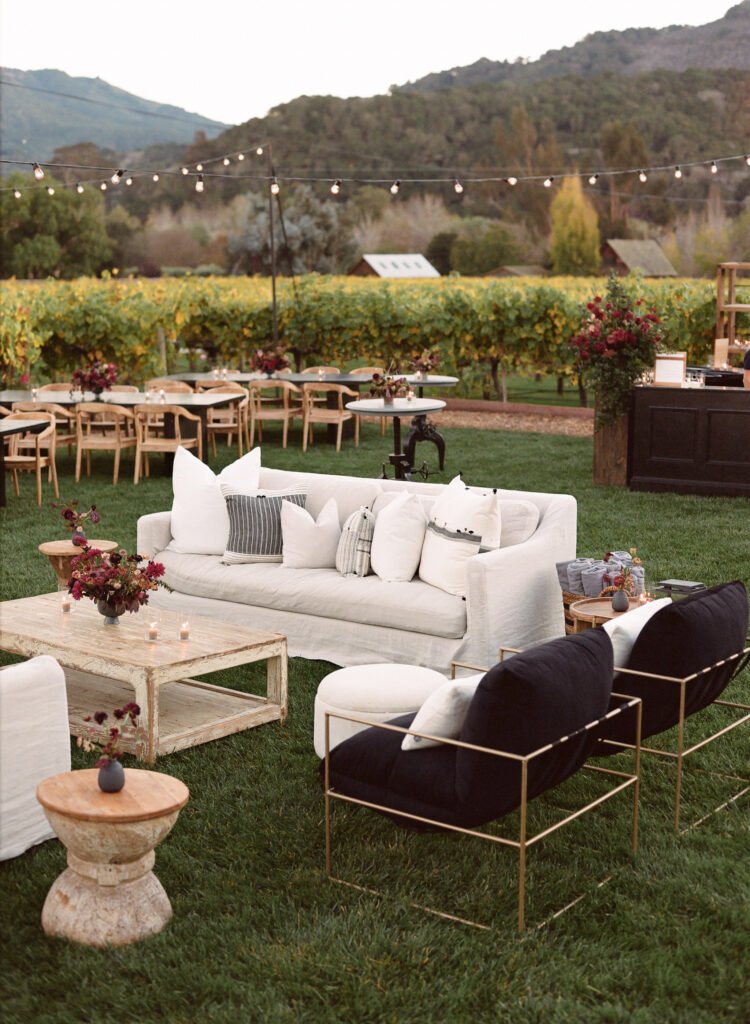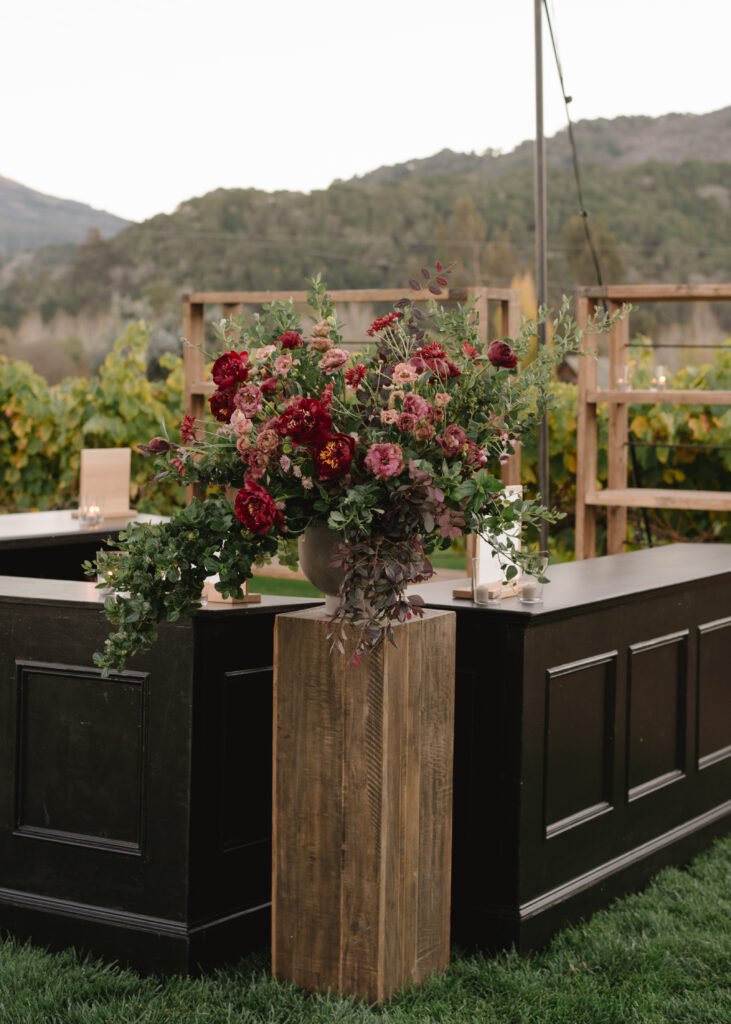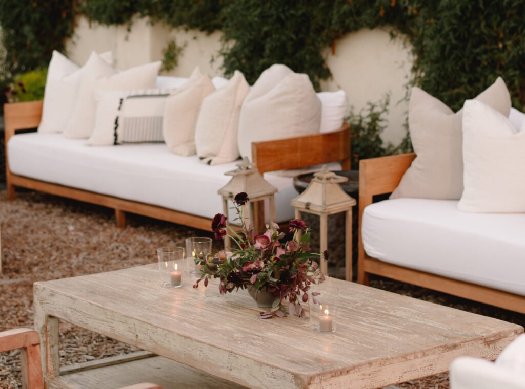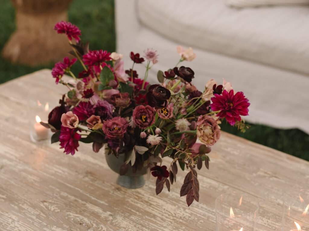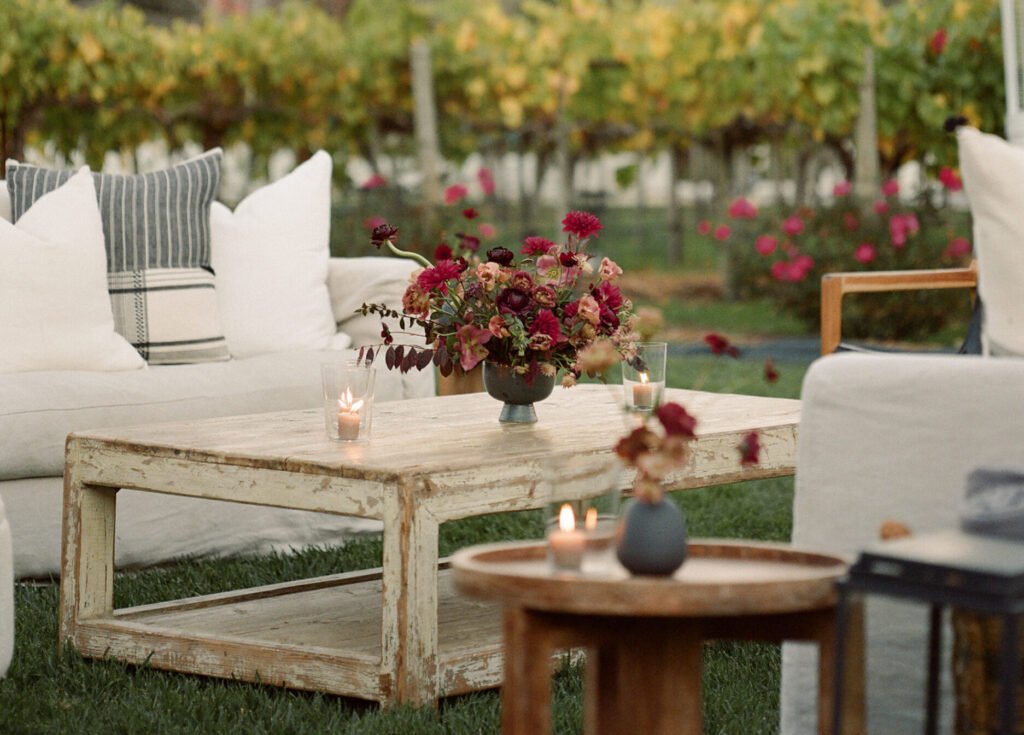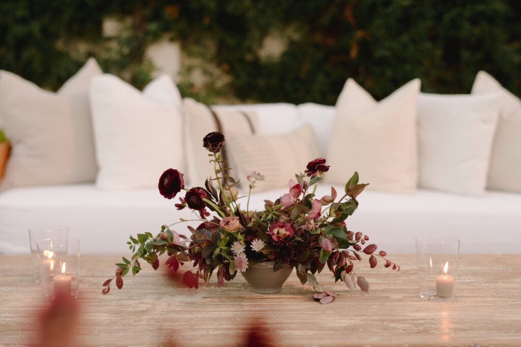 Leaning into fall seasonal elements we incorporated bold berry tones which contrasted nicely against matte black wood and white linen lounge furnishings.
