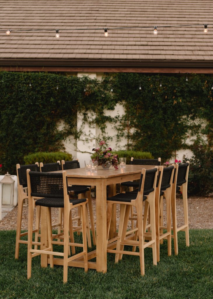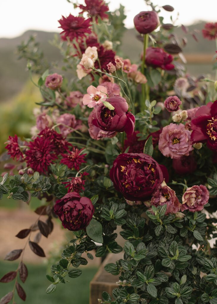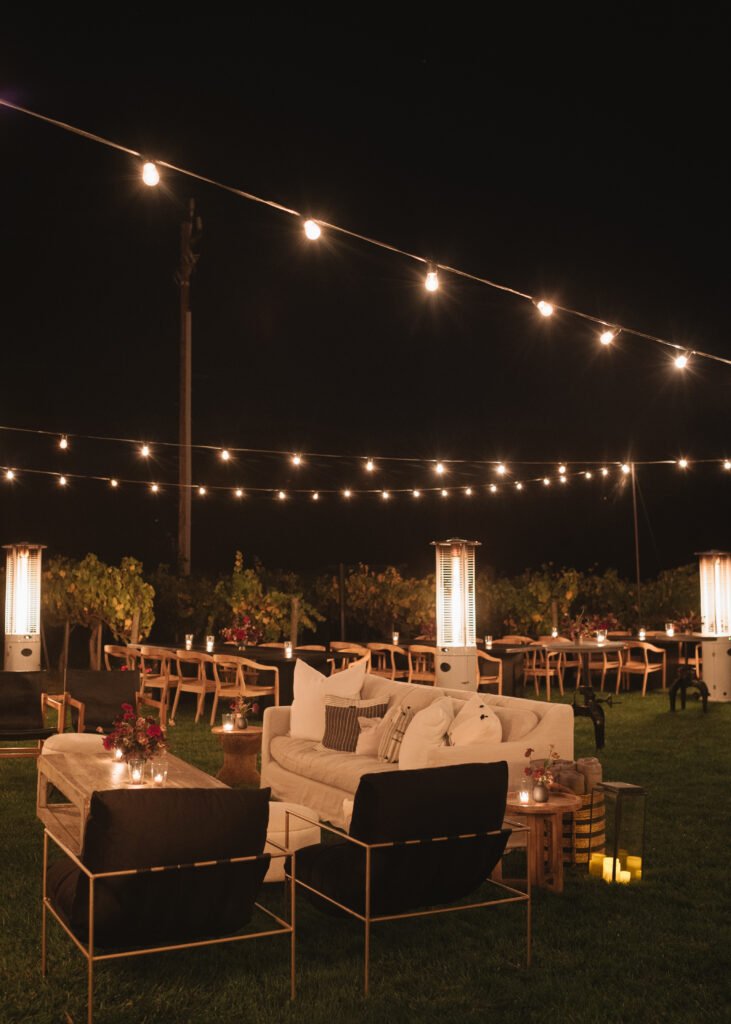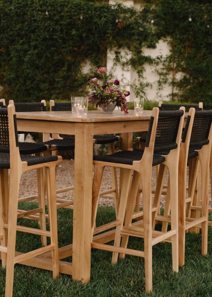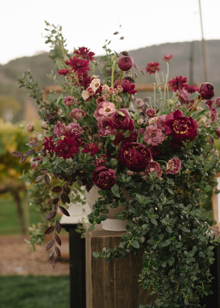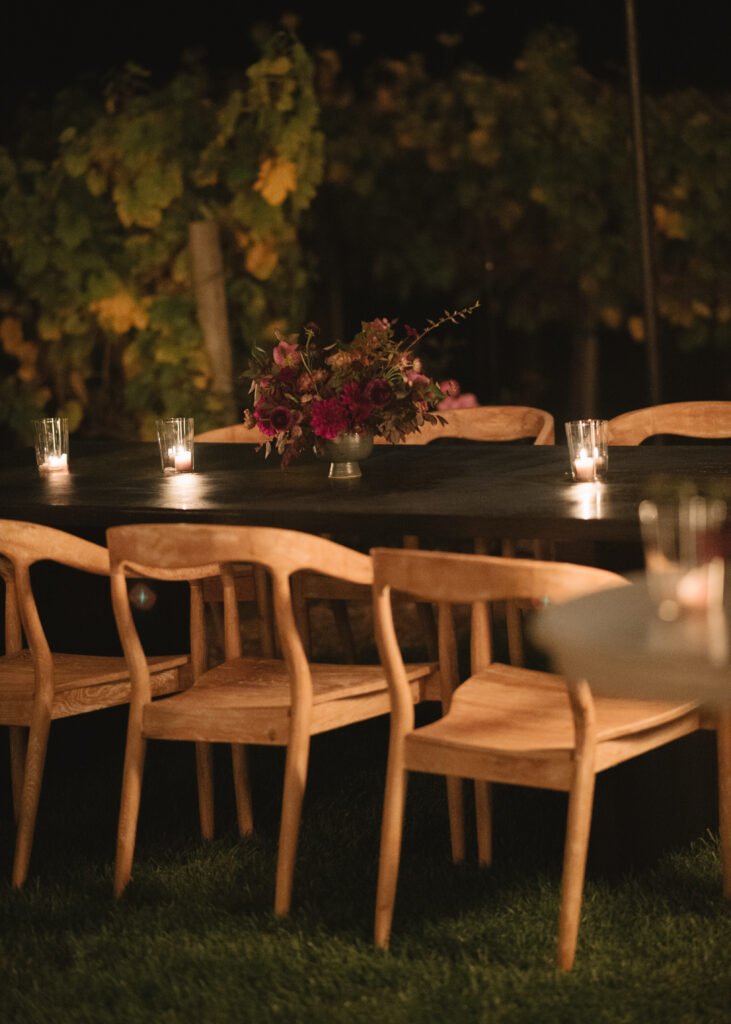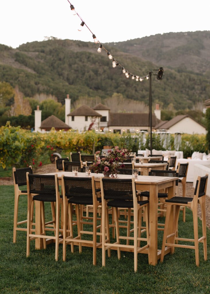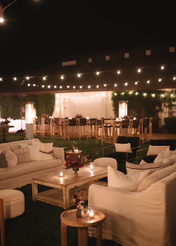 Leaning into fall seasonal elements we incorporated bold berry tones which contrasted nicely against matte black wood and white linen lounge furnishings.